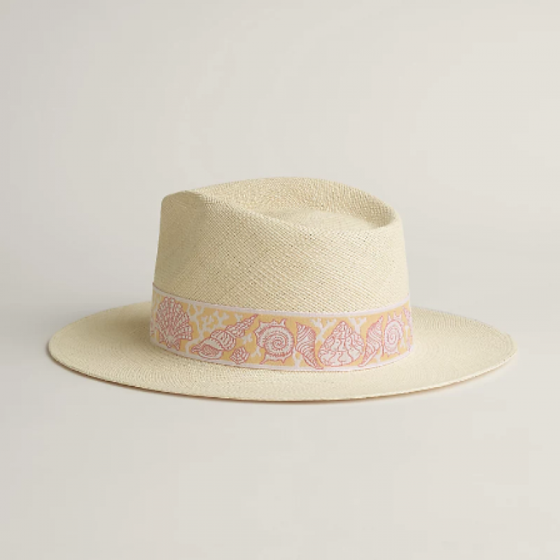巴拿馬布雷紗女士帽子,蝴蝶結帽帶飾有提花「Coquillages」圖案。
